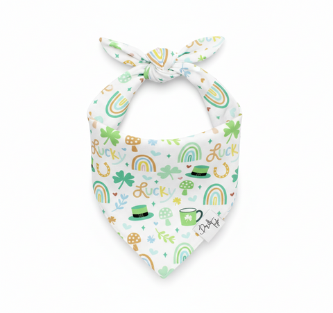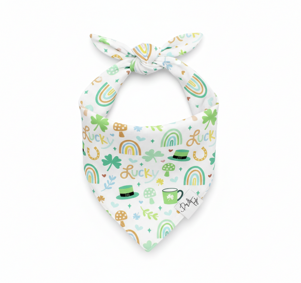 The Lucky Dog Bandana is bursting with St. Patrick’s Day charm — complete with rainbows, shamrocks, horseshoes, and leprechaun hats on a crisp white background. Whether your dog’s chasing clovers or spreading good vibes, this cheerful design brings all the luck (and style) to every walk.