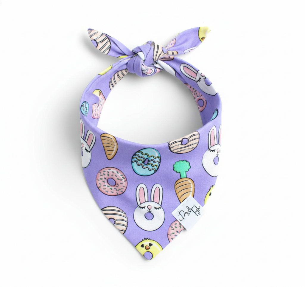 Sweet, silly, and full of springtime fun — the Easter Donuts Dog Bandana is a must-have for festive pups! Decorated with pastel donuts, sleepy bunnies, cheerful chicks, and bright Easter eggs, this adorable print adds a sprinkle of joy to every holiday outing.
