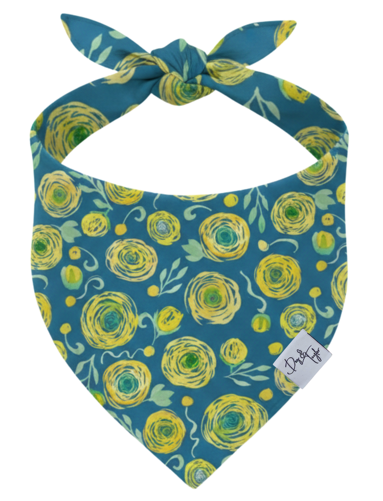 Brighten your pup’s look with the cheerful charm of the Golden Garden Bandana. Featuring playful golden blooms and soft leafy accents set against a rich blue backdrop, this artistic floral design brings warmth and personality to everyday walks and special outings alike. Inspired by sunlit gardens in full bloom, it’s the perfect accessory for pups who love to stand out in vibrant, botanical style.