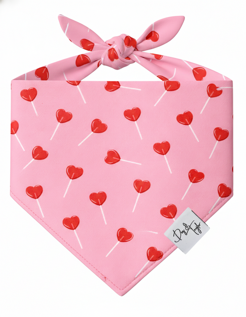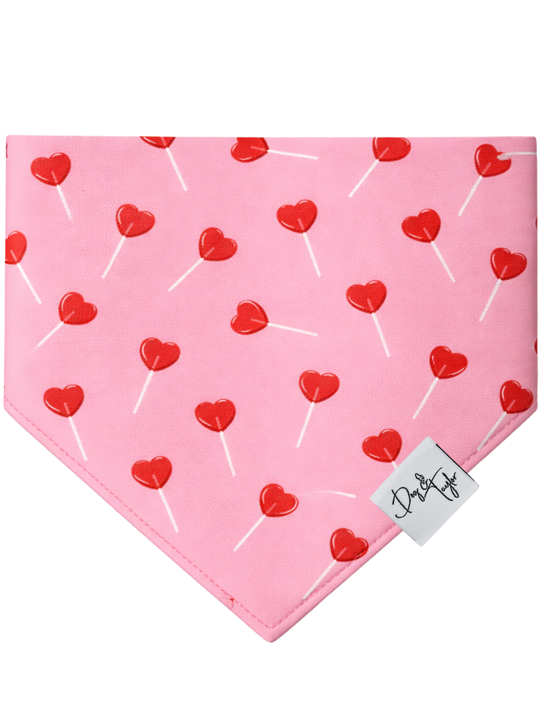The Heart Pop Dog Bandana is made for pups who love to charm everyone they meet. Featuring adorable heart-shaped lollipops scattered across a soft pink background, this cheerful design brings just the right mix of fun, sweetness, and everyday style.