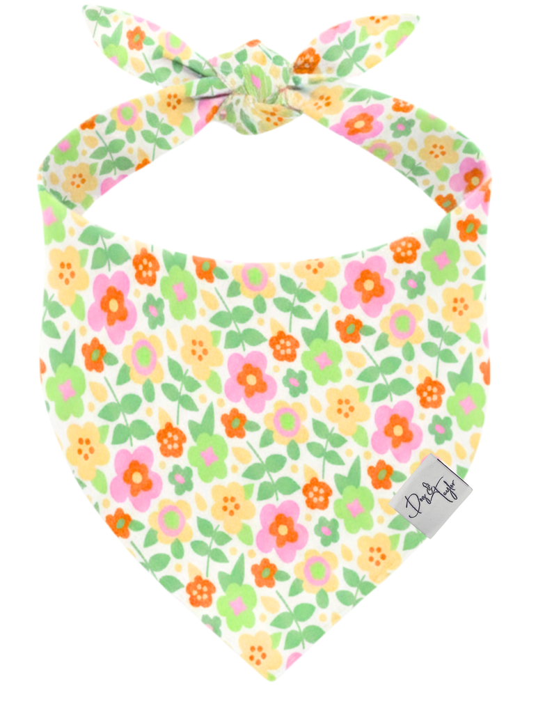 Bring a touch of springtime charm to your pup’s wardrobe with the Meadow Bloom Bandana. Featuring a delightful mix of pastel florals in soft pinks, sunny yellows, and fresh greens, this cheerful design is inspired by blooming meadows and warm, sunny days. Perfect for everyday wear, park playdates, or special outings, it adds a fresh and vibrant look to your furry friend’s style.