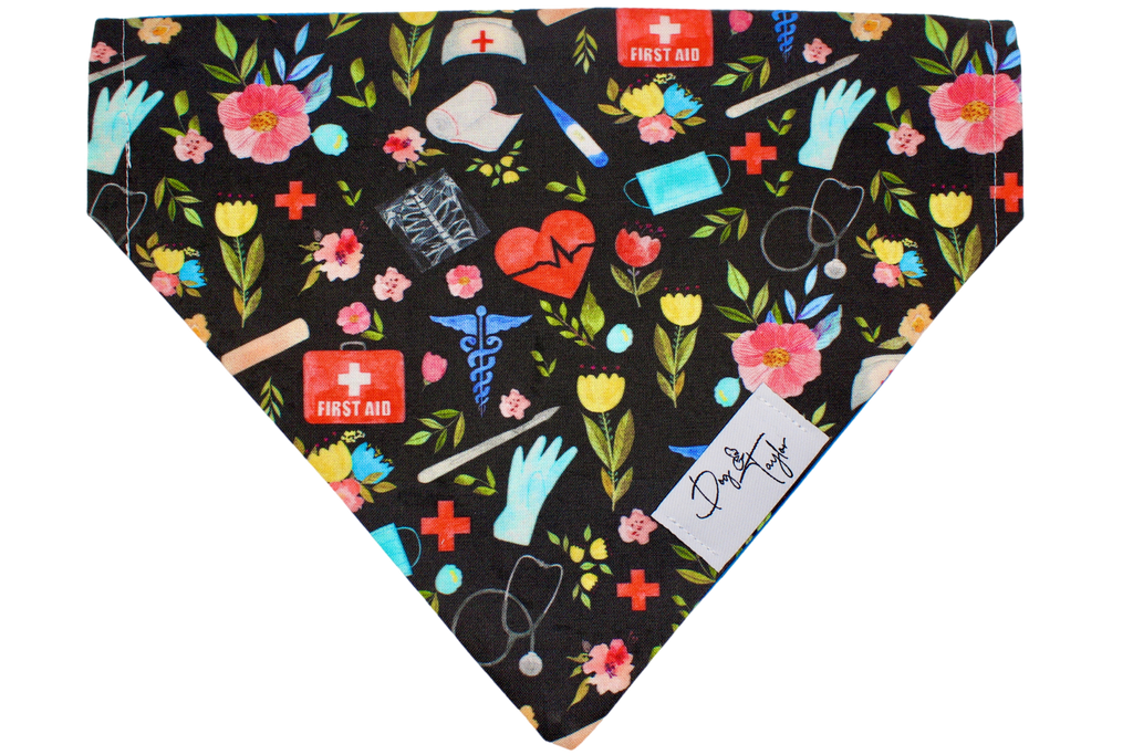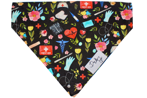 The Healthcare Hero Dog Bandana celebrates all the everyday heroes who keep us healthy👩⚕️🐾. Featuring medical icons — stethoscopes, first aid kits, gloves, and hearts — beautifully arranged among blooming florals on a sleek black background, this bandana honors compassion, care, and courage.
